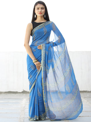 Blue Mustard Hand Block Printed Chiffon Saree with Zari Border - S031703967