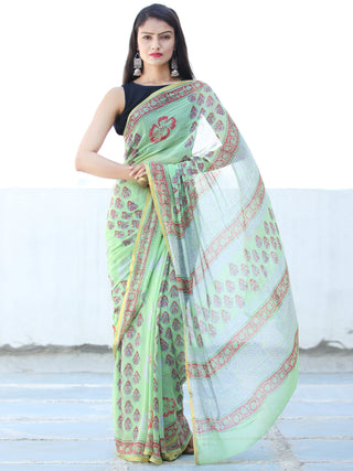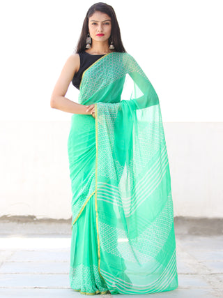 Greeen White Hand Block Printed Chiffon Saree with Zari Border - S031703914