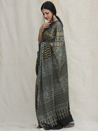 Charcoal Black Ivory Olive Green Ajrakh Hand Block Printed Modal Silk Saree - S031704132