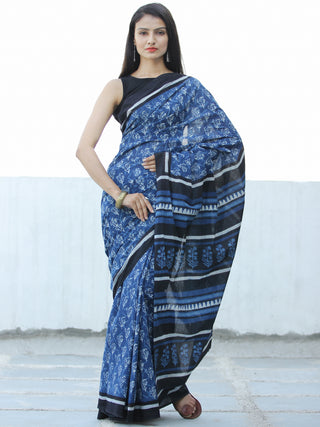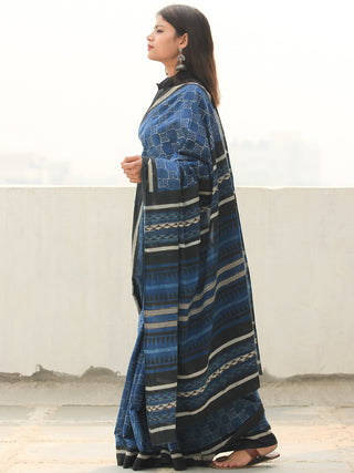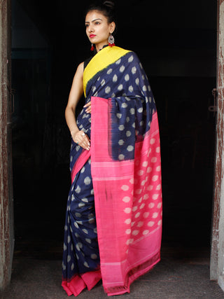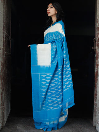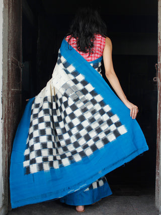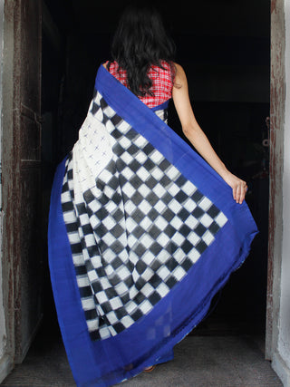 Midnight Blue Off White Double Ikat Handwoven Mercerised Cotton Saree - S031703541