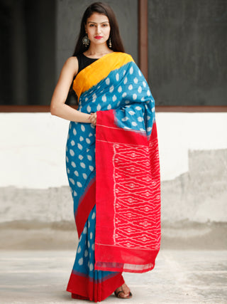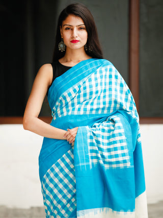 Sky Blue Bottle Green Black White Ikat Handwoven Mercerised Cotton Saree - S031703623