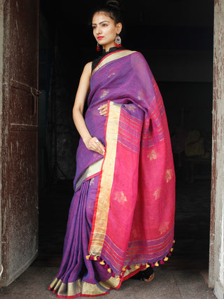 Purple Magenta Golden Handwoven Linen Jamdani Saree With Zari Border & Tassels - S031704022