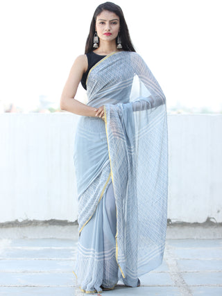 Pastel Blue White Hand Block Printed Chiffon Saree with Zari Border - S031703937
