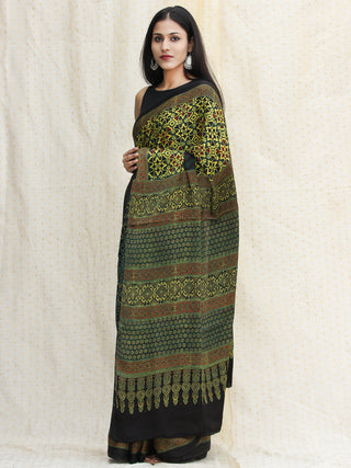 Bottle Green Black Lime Green Ajrakh Hand Block Printed Modal Silk Saree - S031704118