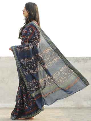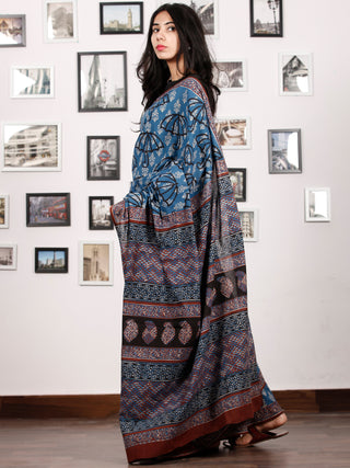 Indigo Black Maroon Chanderi Silk Ajrakh Hand Block Printed Saree With Geecha Border - S031702656