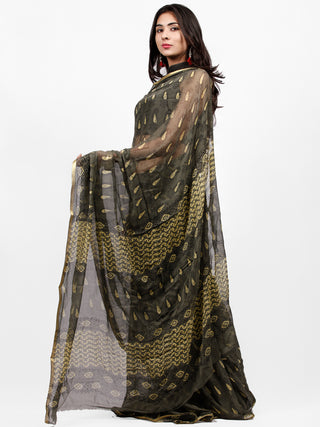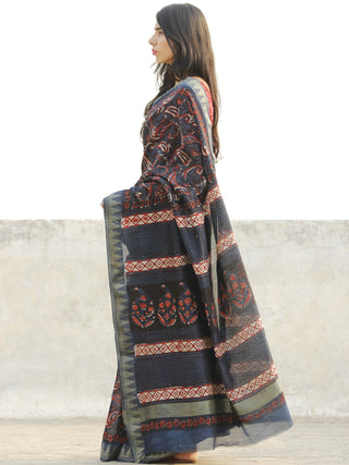 Olive Green Maroon Black Ivory Hand Block Printed Cotton Mul Saree - S031703010