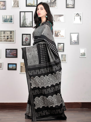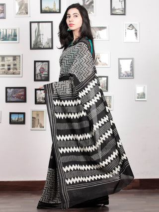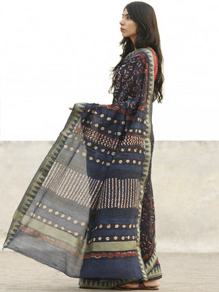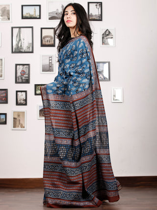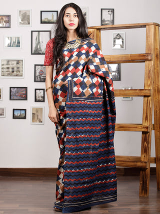 Indigo Rust Black White Hand Block Printed Cotton Saree In Natural Colors - S031702921