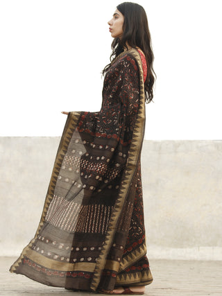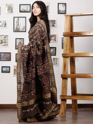 Chocolate Brown Maroon Black Chanderi Silk Hand Block Printed Saree With Geecha Border - S031702655