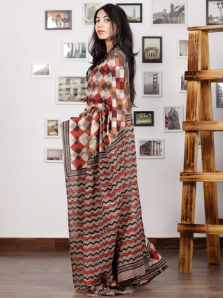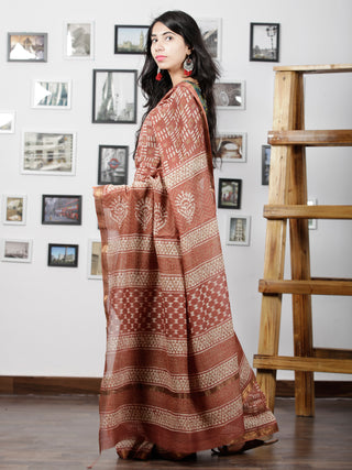 Brown Maroon Ivory Chanderi Silk Hand Block Printed Saree With Geecha Border - S031702982