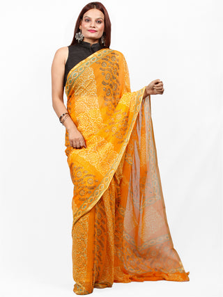 Golden Yellow Hand Block Printed Chiffon Saree with Zari Border - S031703421