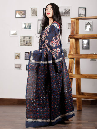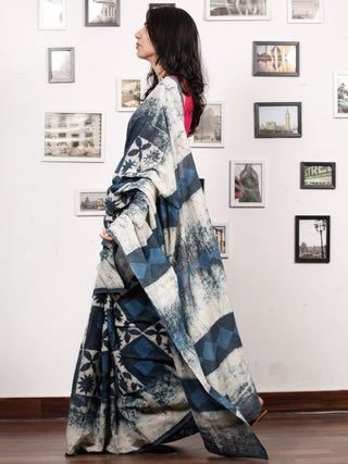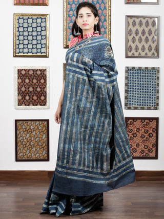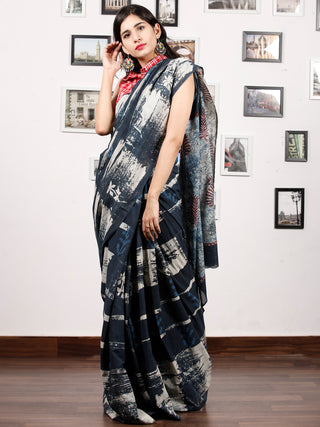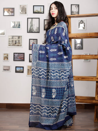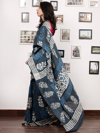 Deep Indigo Ivory Hand Block Printed & Hand Brush Painted Cotton Mul Saree - S031703174