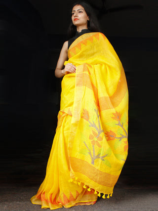 Yellow Red Green Handwoven Linen Jamdani Saree With Temple Border - S031703461