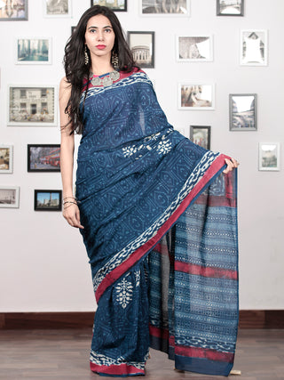 Indigo Red Ivory Chanderi Silk Hand Block Printed Saree With Geecha Border - S031702642