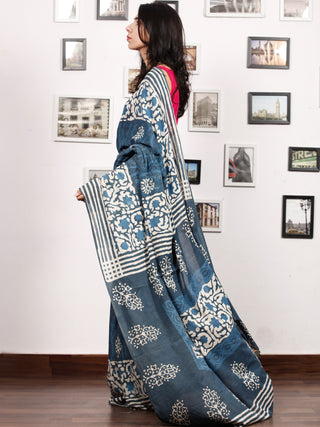 Indigo White Hand Block Printed & Hand Painted Cotton Mul Saree - S031703112