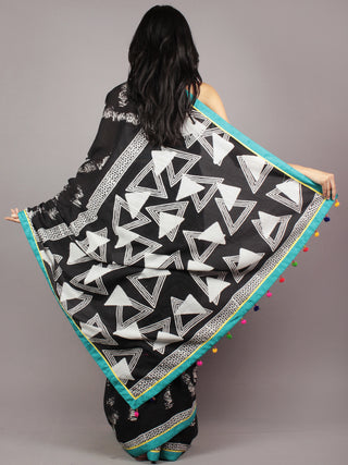 Black White Seagreen Yellow Hand Block Printed Cotton Saree With Tassels - S031701721