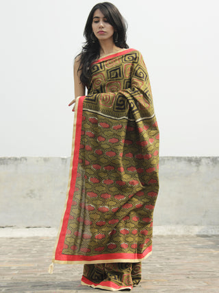 Olive Green Black Maroon Ivory Hand Block Printed Cotton Saree With Red Border & Tassels - S031702290