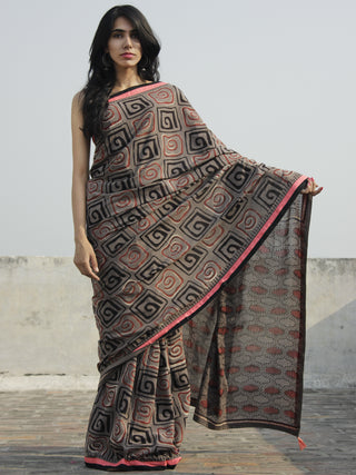 Kashish Black Maroon Hand Block Printed Cotton Saree With Peach Border & Tassels - S031702294