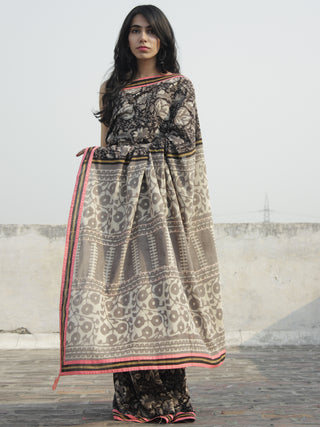 Kashish Black Ivory Hand Block Printed Cotton Saree With Peach Border & Tassels - S031702298