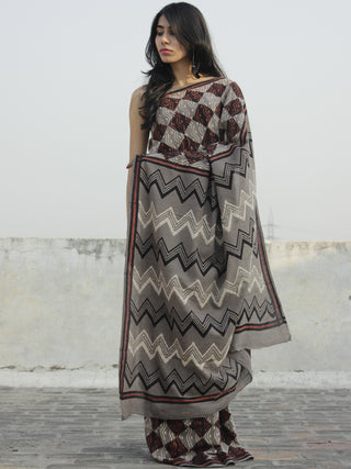 Black White Grey Red Hand Block Printed Cotton Saree With Tassels - S031701717