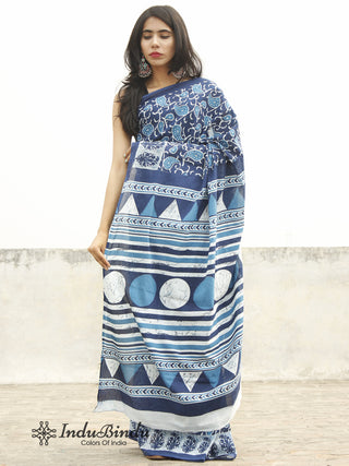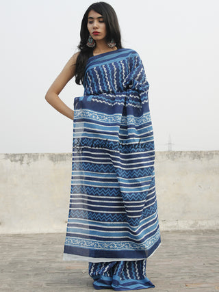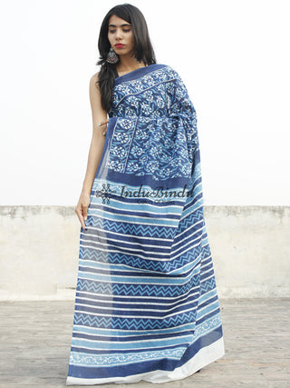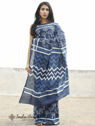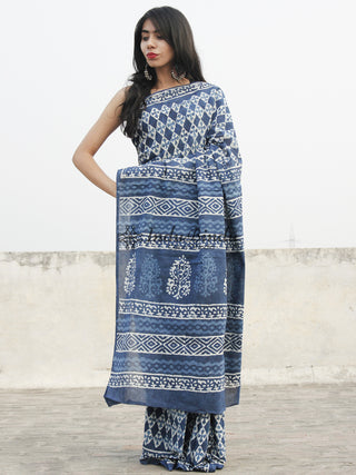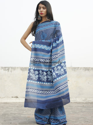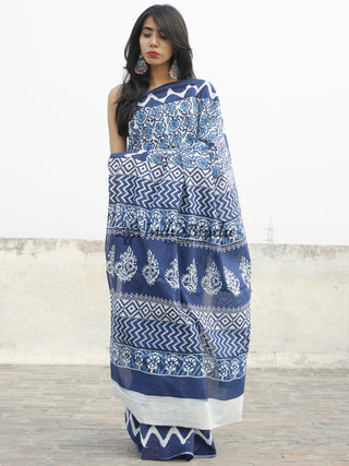 Indigo Blue White Hand Block Printed Cotton Saree In Natural Colors - S031702363