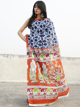 Indigo Blue White Red Hand Block Printed Cotton Saree With Kalamkari Printed Pallu - S031702361