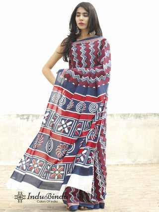 Indigo Maroon White Hand Block Printed Cotton Saree In Natural Colors - S031702371