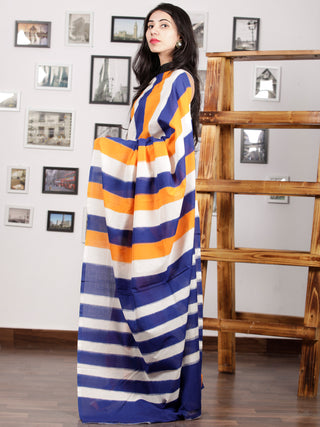 Indigo Orange White Ikat Handwoven Pochampally Mercerized Cotton Saree - S031701590