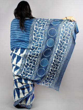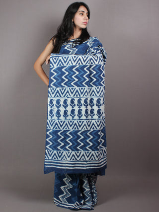 Indigo White Hand Block Printed in Natural Colors Cotton Mul Saree - S03170423