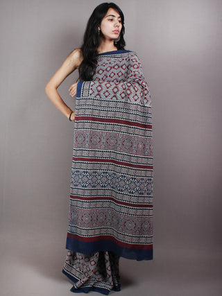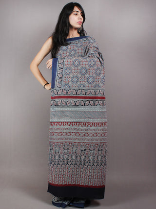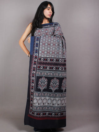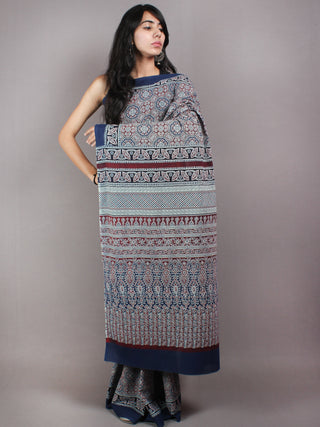 Maroon Ivory Indigo Mughal Nakashi Ajrakh Hand Block Printed in Natural Vegetable Colors Cotton Mul Saree - S03170603