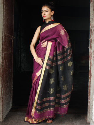 Purple Golden Black Handwoven Linen Jamdani Saree With Zari Border & Tassels - S031704014
