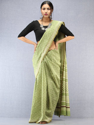 Light Green Ivory Maheshwari Silk Hand Block Printed Saree With Zari Border - S031704479