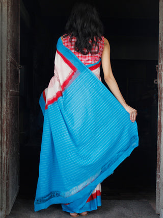 Sky Blue Ivory Black Ikat Handwoven Pochampally Mercerized Cotton Saree - S031701578
