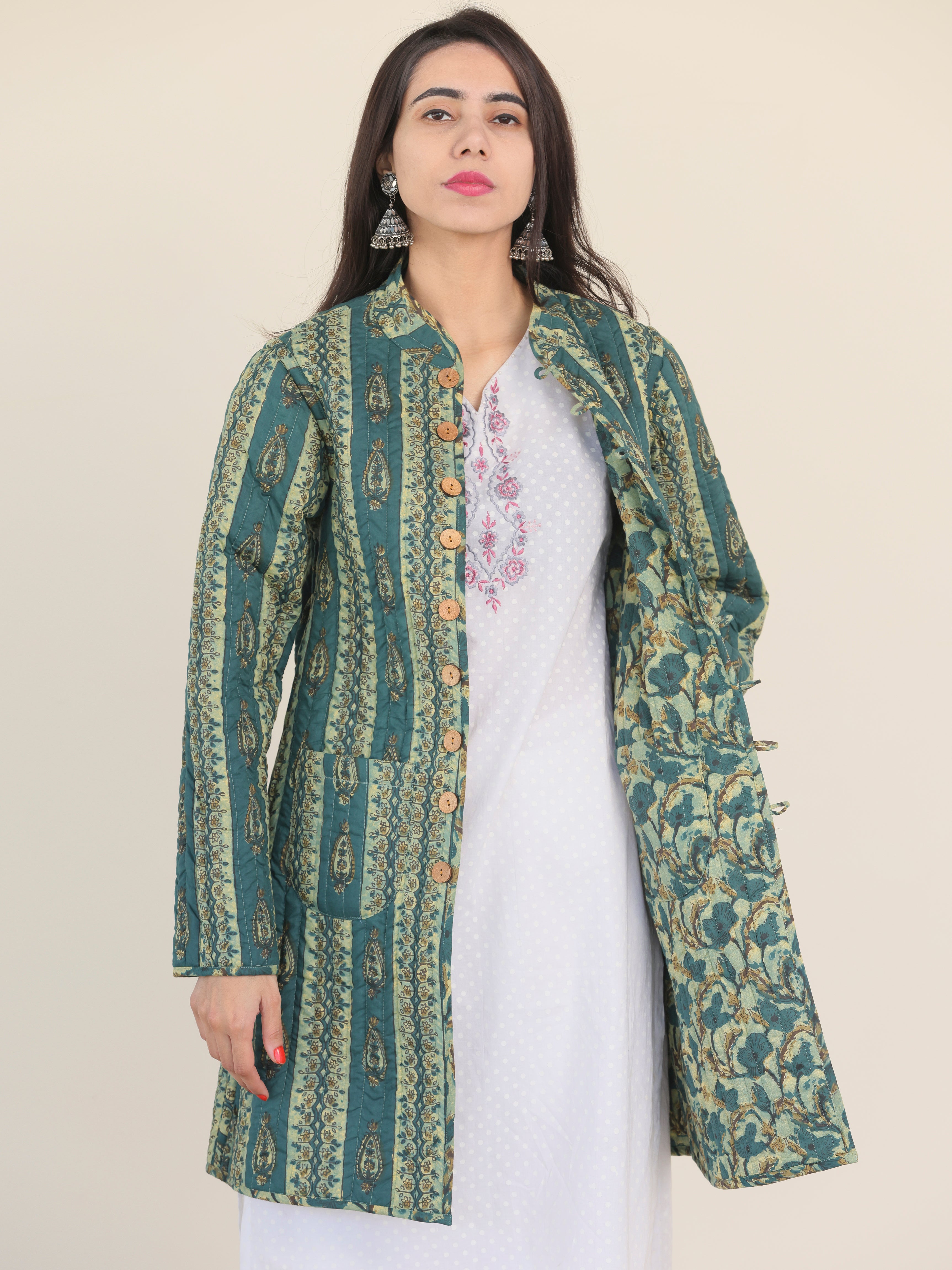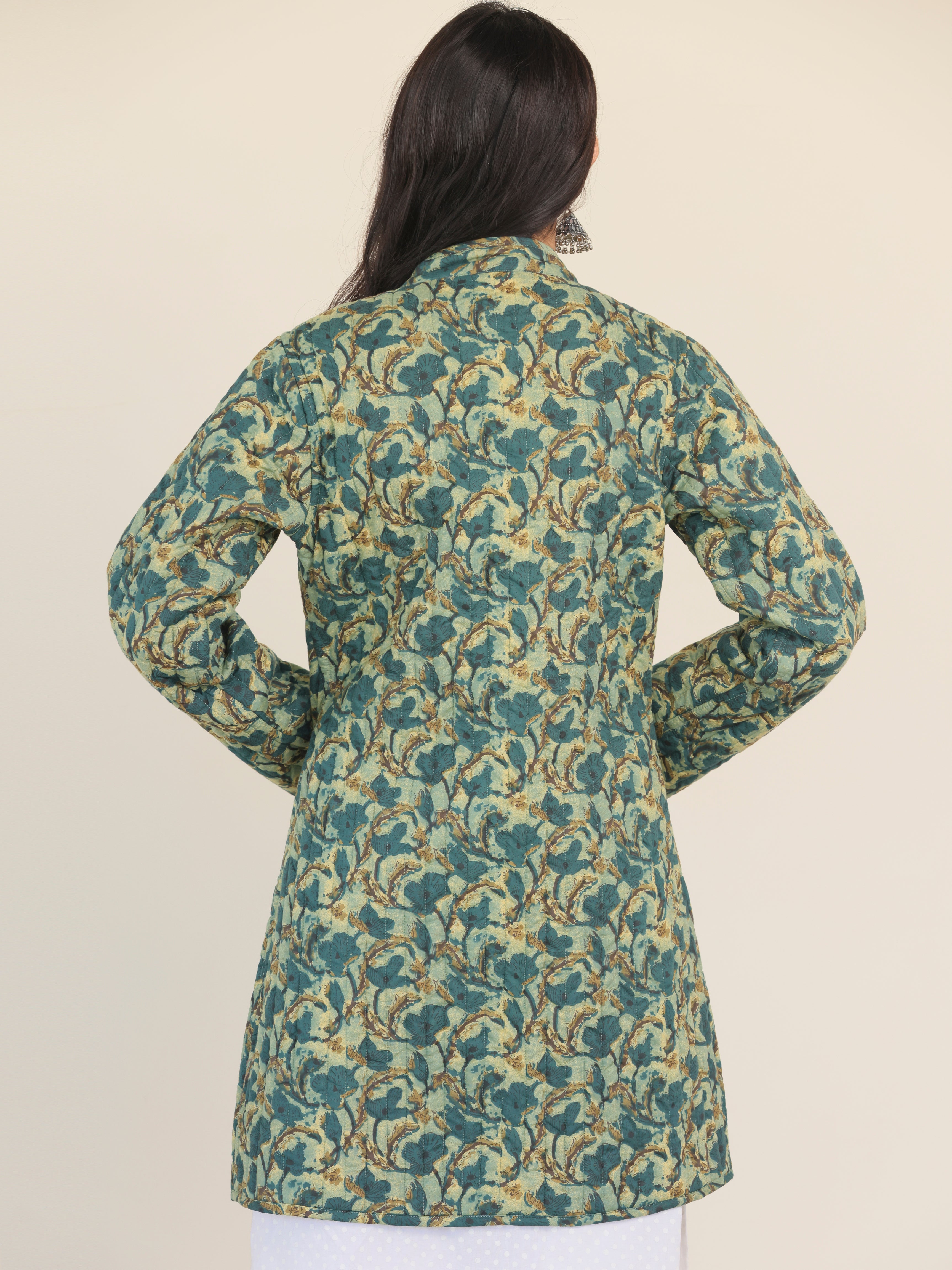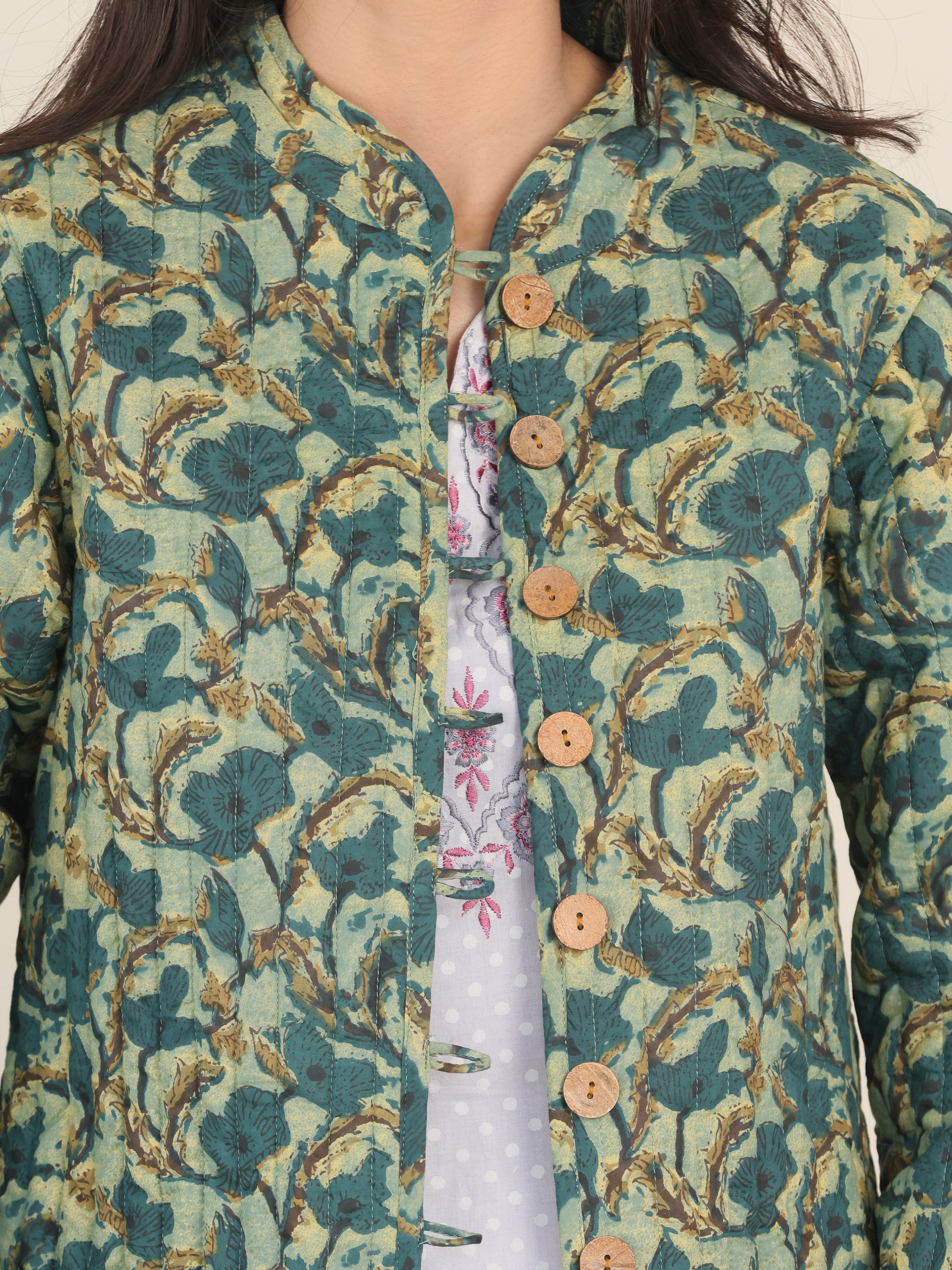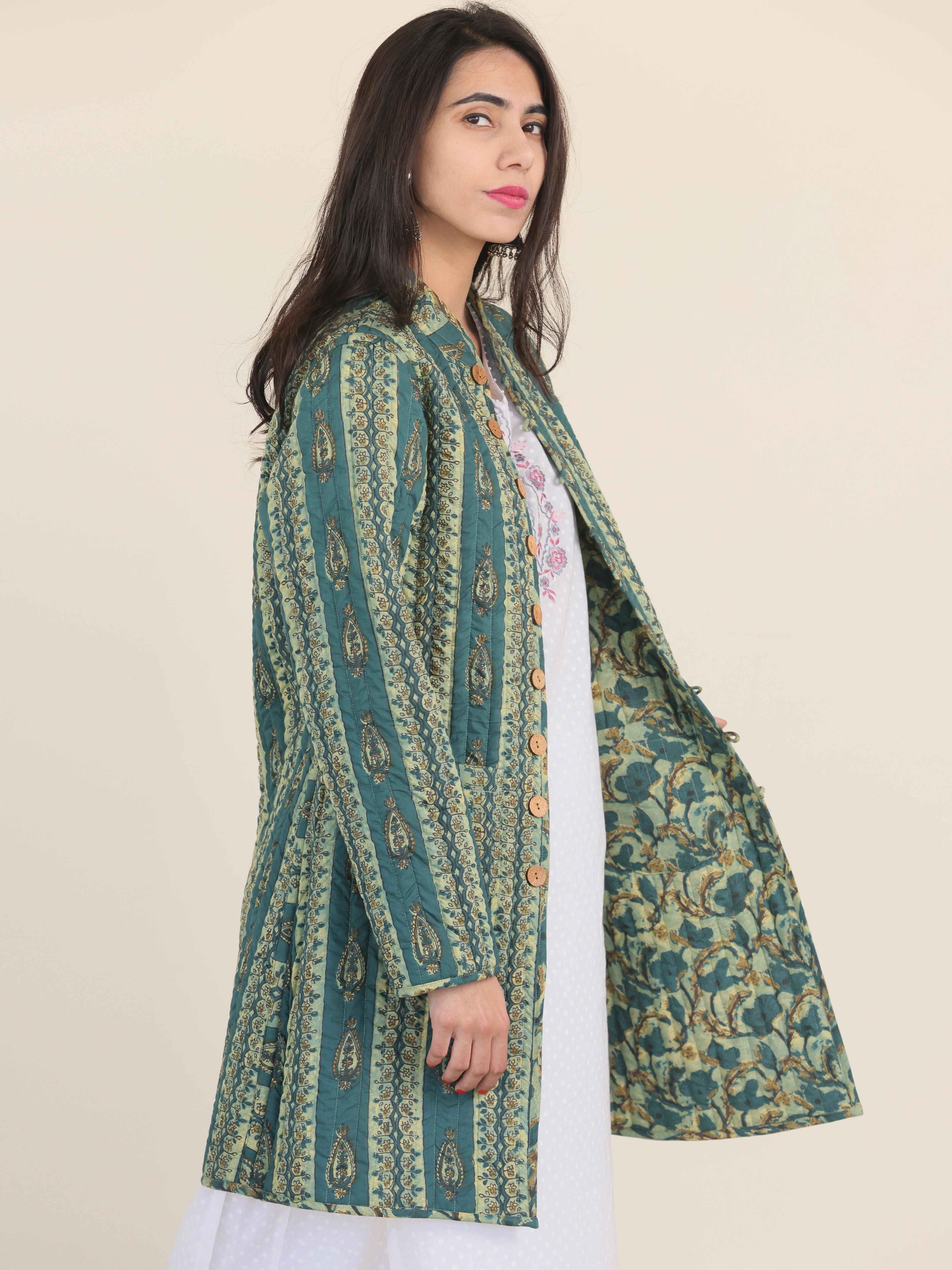 PRODUCT: Handcrafted Reversible Quilted Jacket with intrinsic and alluring work of block print on both the sides.