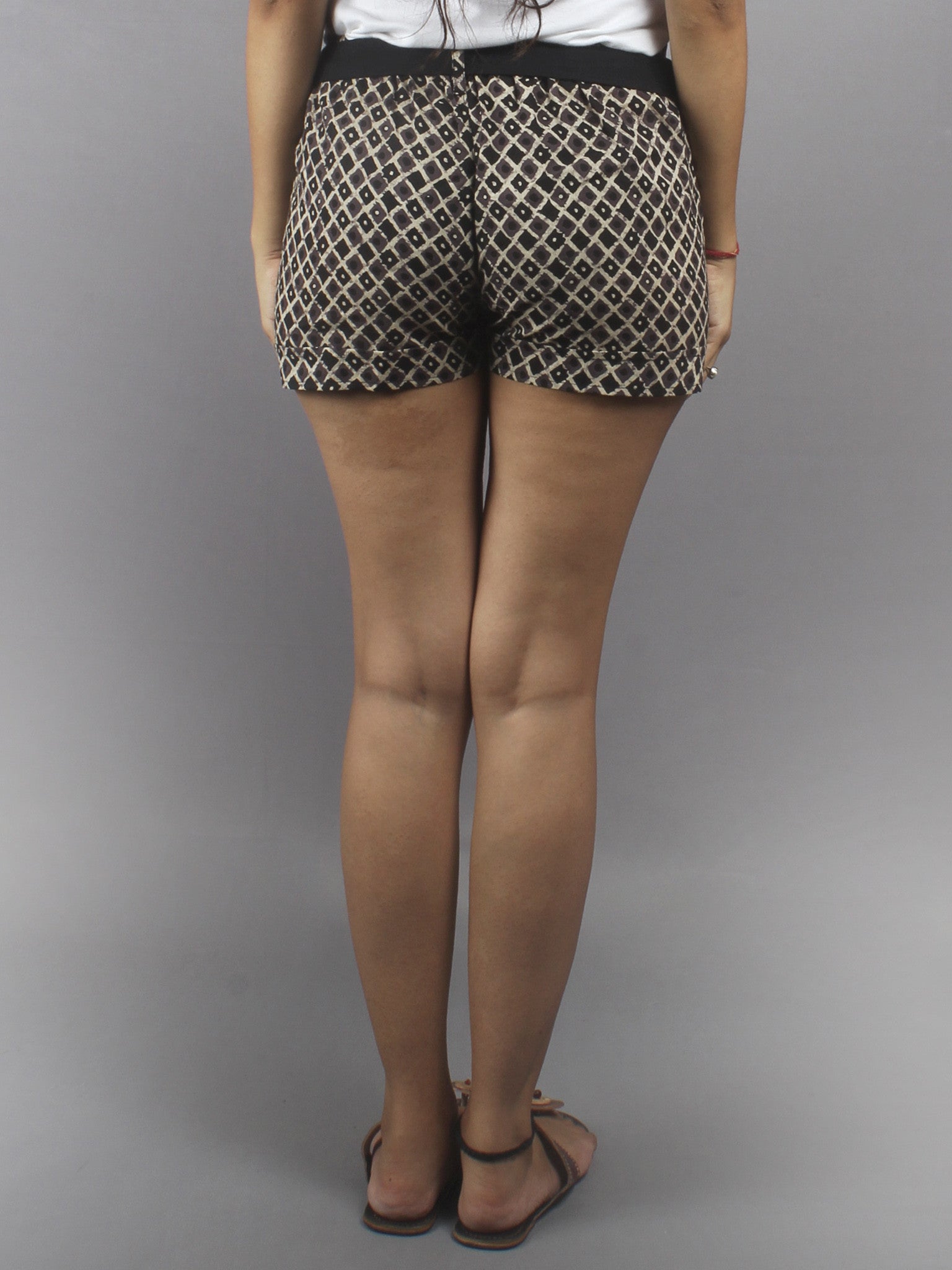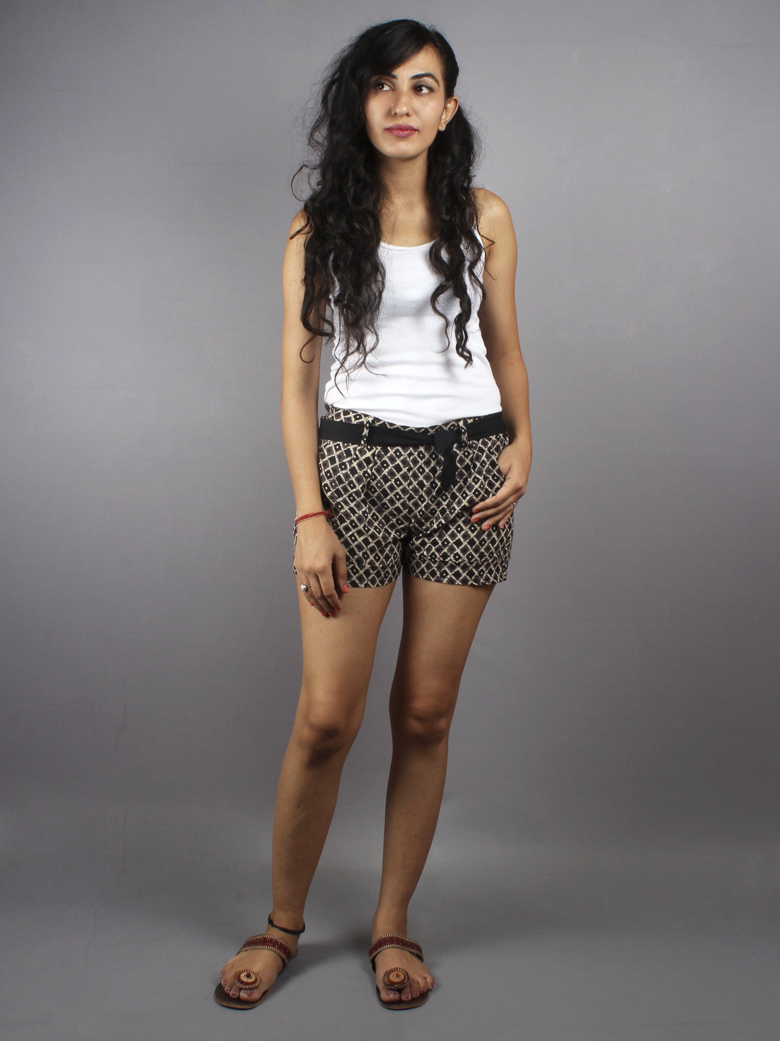 Beige Hand Block Printed Shorts With Belt -S5296031