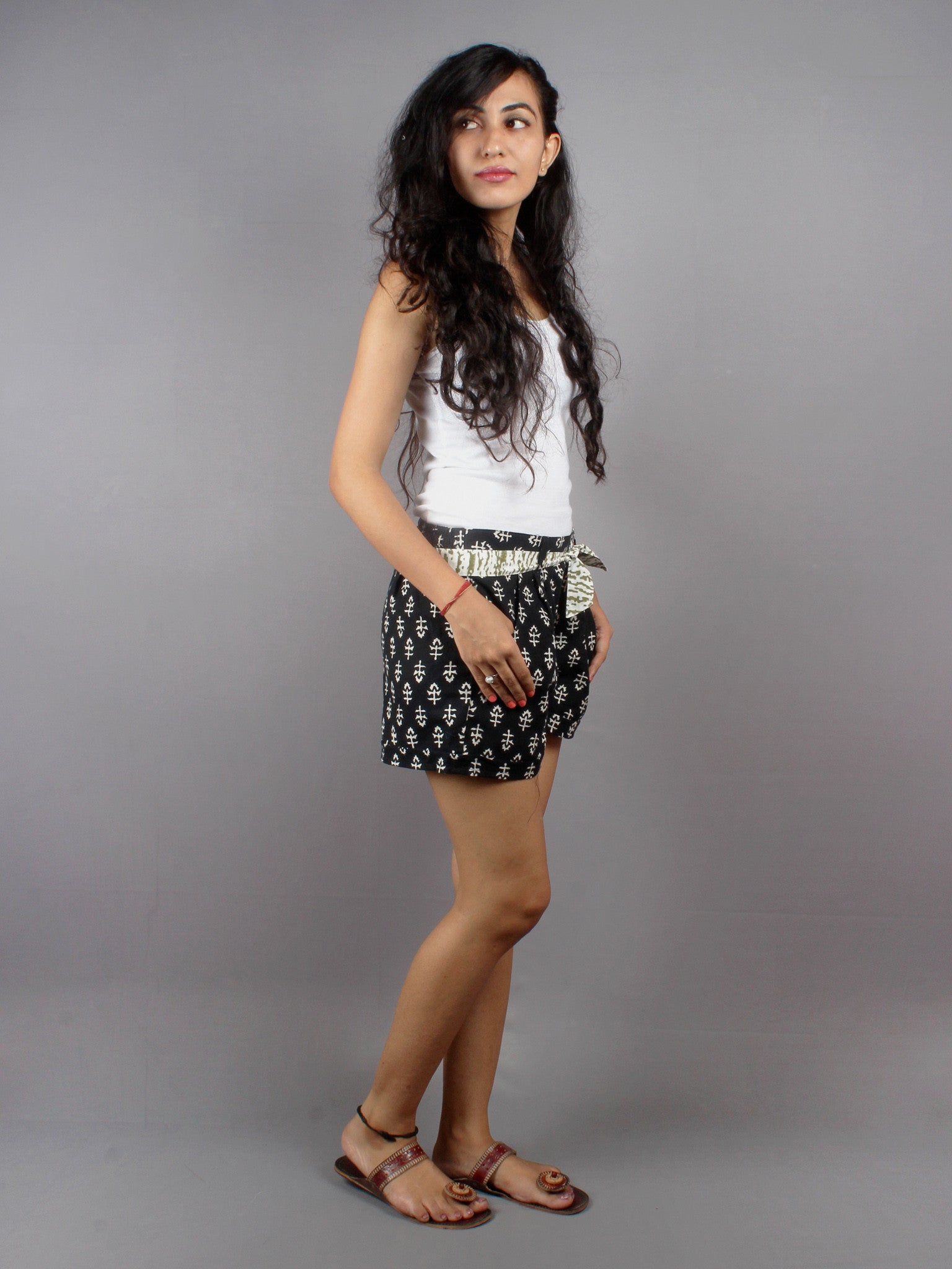 Black Hand Block Printed Shorts With Belt -S5296018