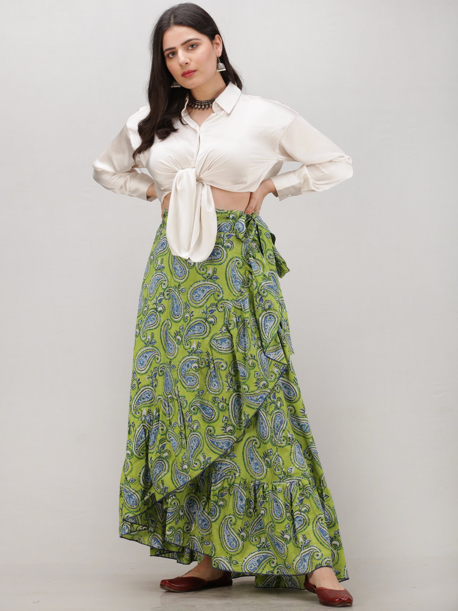 Green Blue Hand Block Printed Frill Wrap Around Skirt - S403F2034