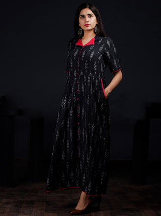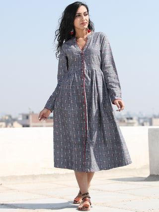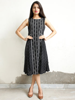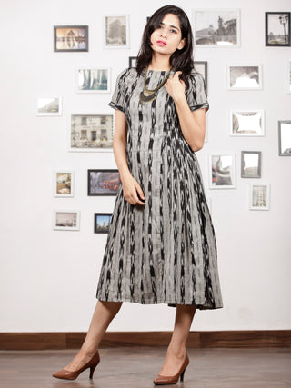 Grey Black Handwoven Ikat Dress With Princess Cut & Knife Pleates- D278F1256