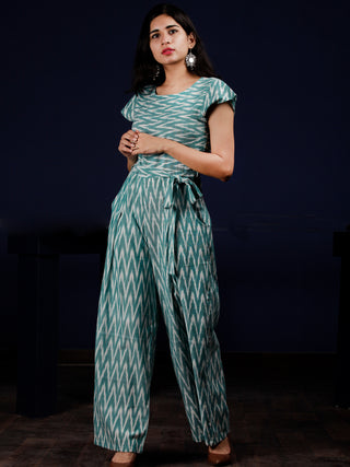 Teal Green Grey Ikat Handwoven Jumpsuit With Belt And Back Zip - D249F1253