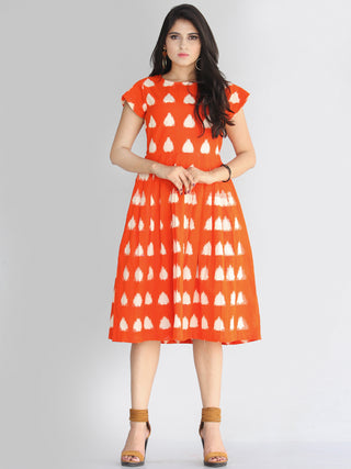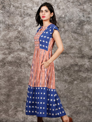 Royal Blue Orange White Handwoven Ikat Dress With Princess Cut & Knife Pleates- D310F1055