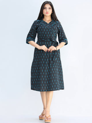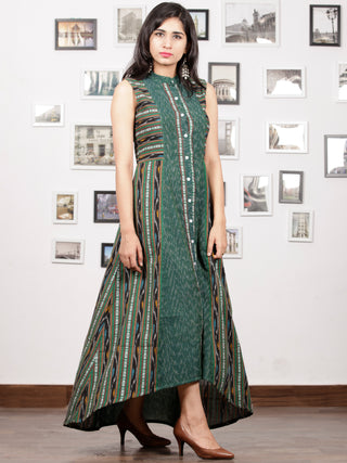 Teal Green White Black Maroon Handwoven Asymmetric Ikat Dress With Front Open- D280F1263