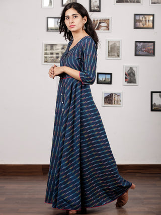 Indigo White Mergenta Long Handwoven Ikat Dress With Collar & Side Pockets - D313F1472