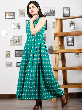 Teal Green White Long Sleeveless Handwoven Double Ikat Dress With Knife Pleats & Side Pockets - D32F1240