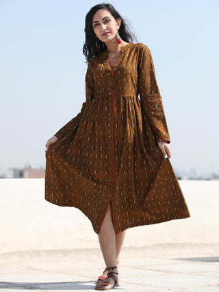 Reddish Brown Ivory Long Ikat Knife Pleated Dress With Side Pockets - D312F1564