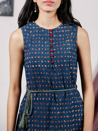Indigo Red Green Hand Block Printed Sleeveless Dress With Tassels - D230F1317