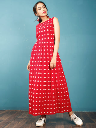 Red White Long Sleeveless Handwoven Double Ikat Dress With Knife Pleats & Side Pockets - D32F1018