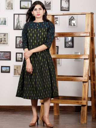 Black Parrot Green Turquoise Handwoven Ikat Middi Dress With Knife Pleates - D289F1445