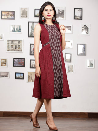 Maroon Ivory Grey Handwoven Ikat Knife Pleated Sleeveless Dress - D276F1463