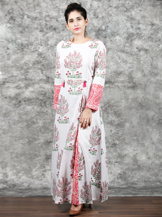 White Pink Green Hand Block Printed Cotton Long Dress With Pintucks - D288F1495