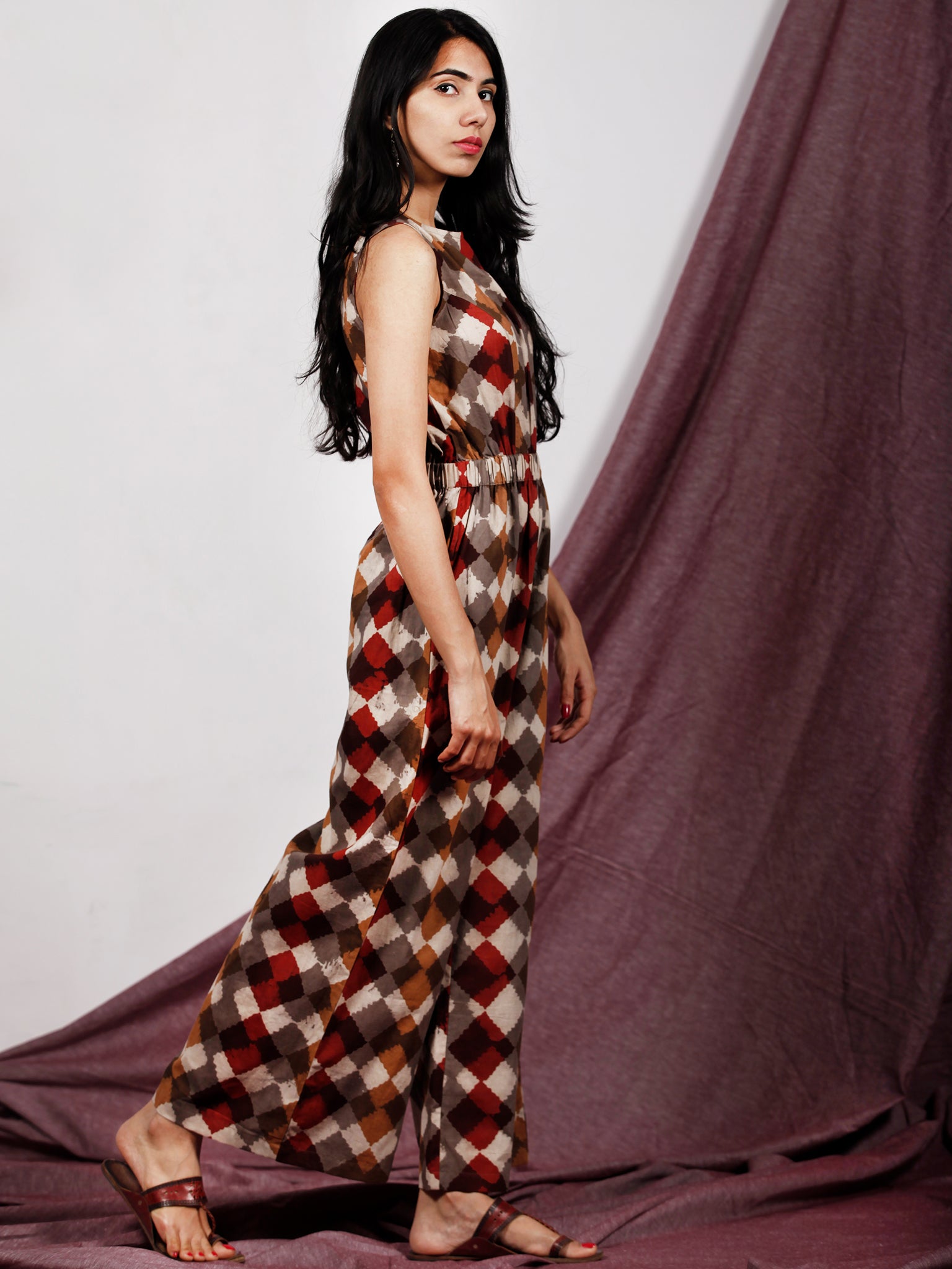 Beige Brown Maroon Handblock Printed Cotton Jumpsuit With Back Zip And Waist Elastic - D234F1323