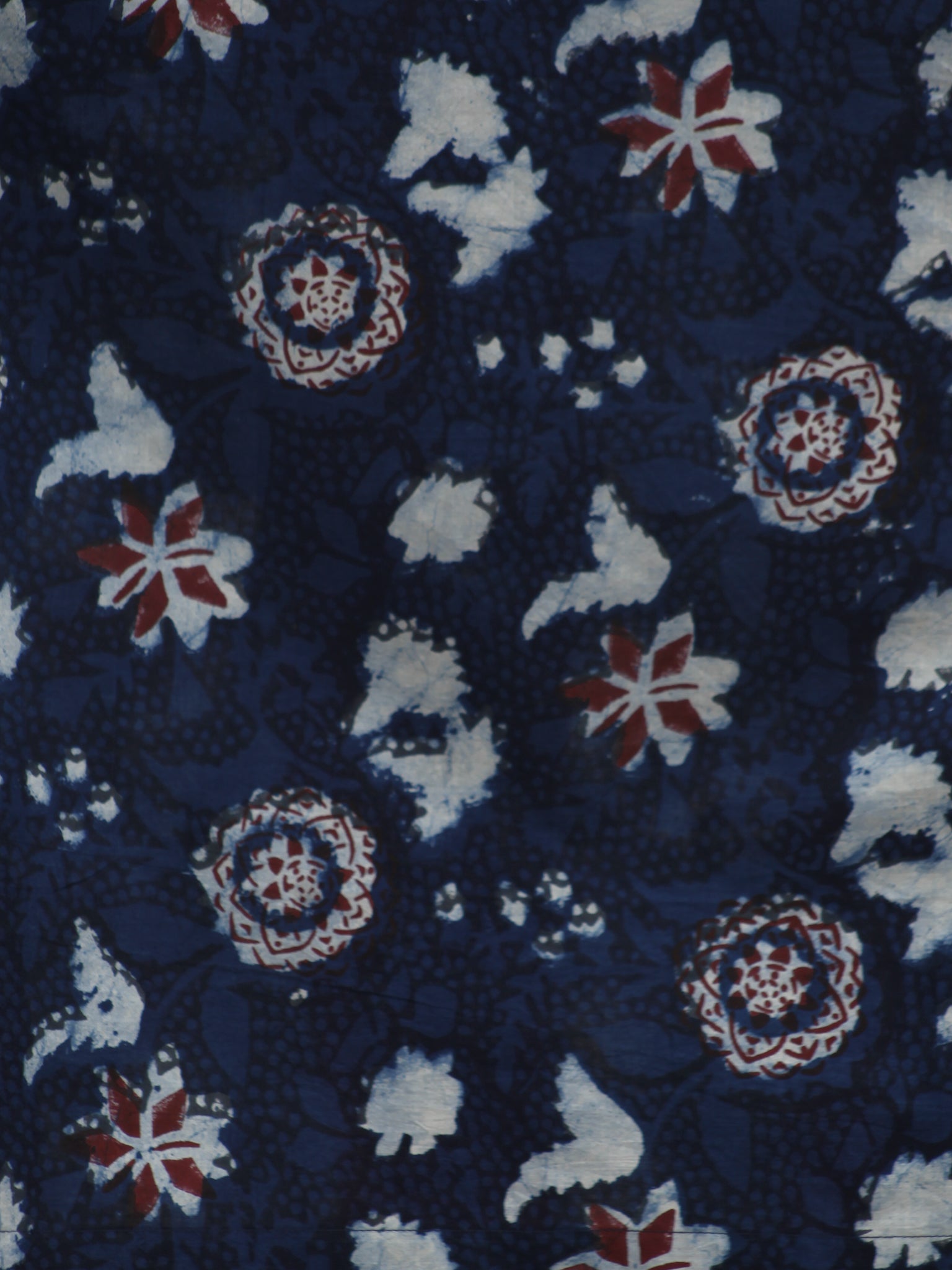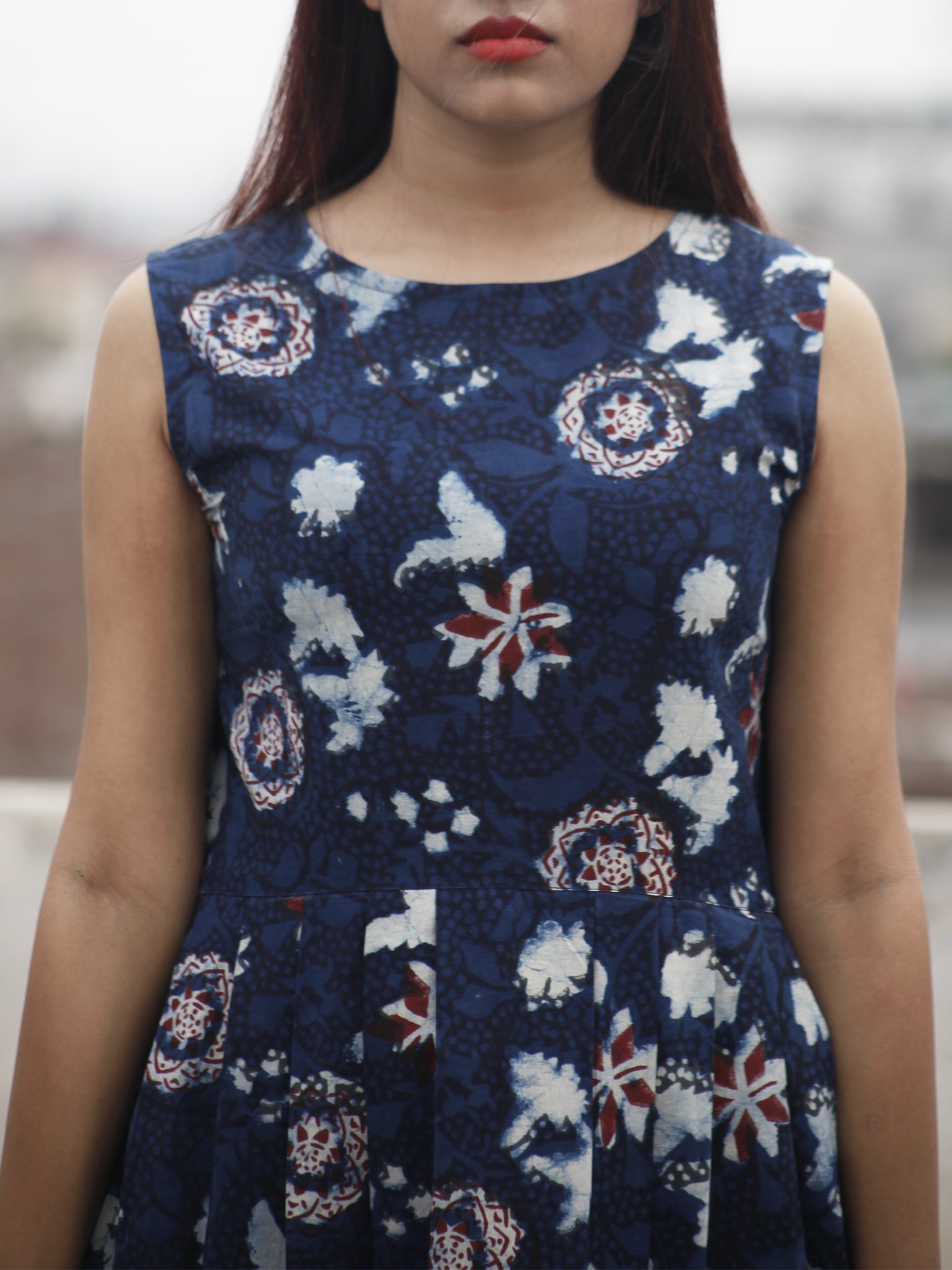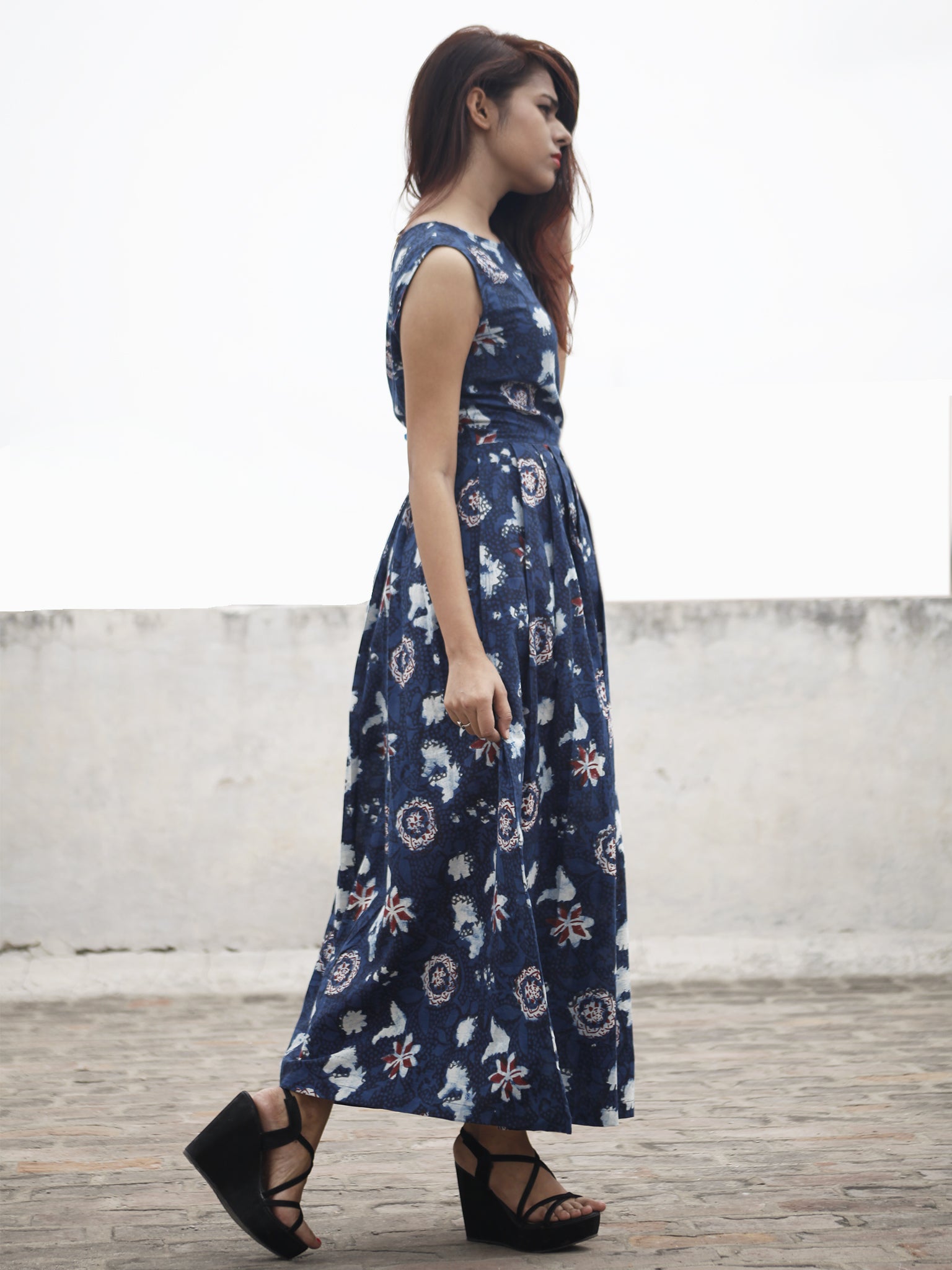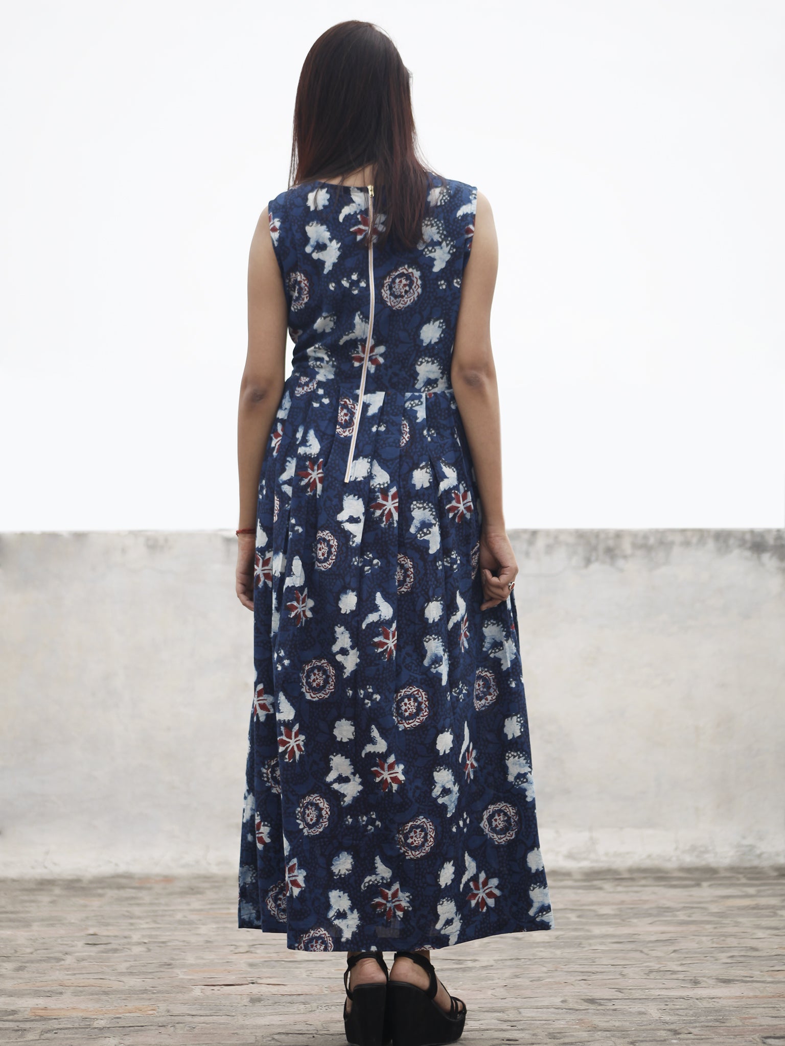 Indigo Ivory Maroon Long Sleeveless Hand Block Printed Cotton Dress With Knife Pleats & Side Pockets - D32F982